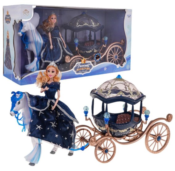 Zestaw lalka, konik, kareta z efektem światła i dźwięku dla dzieci powyżej 3-go roku życia. Zestaw pozwala się przenieść w świat magii. Konik porusza się do przodu i wydaje dźwięki jak prawdziwe zwierzę. Kareta oświetlona jest mrugającymi światełkami (niebiesko-czerwonymi). Laleczka posiada ruchome rączki i nóżki, śliczną balową sukienkę i długie włosy. Konik zasilany jest bateriami typu 3 x AA 1,5 V (brak w zestawie). Kareta bateriami typu 3 x AG13 (w zestawie).