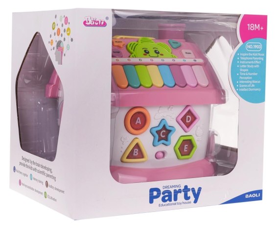 Interaktywny, edukacyjny domek dla dzieci od 18-go miesiąca życia. Domek wykonany został z najlepszej jakości plastiku, w żywych kolorach, przyciągających wzrok dziecka i zachęcających do edukacyjnej zabawy. Domek posiada 4 ściany oferujące różne atrakcje, różowy daszek oraz rączkę do przenoszenia. Zabawka zasilana jest bateriami typu 3 x AA 1,5 V (brak w zestawie). Do zestawu dołączone jest również różowe autko.