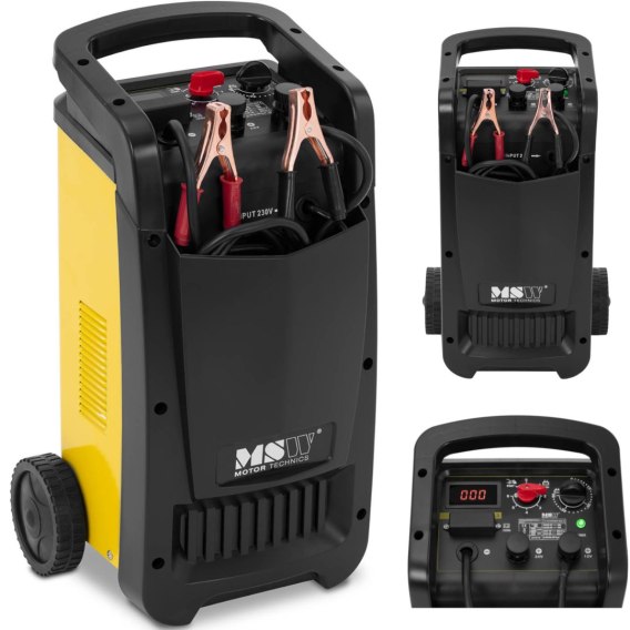 Kod producenta: 10062366 Profesjonalny i kompaktowy prostownik samochodowy marki MSW pozwala szybko i łatwo uruchomić auto, aby znów ruszyło. Nie pozwala on rozładować się baterii i ładuje ją, gdy zacznie tracić moc. Niezależnie od tego, czy uruchamiany jest silnik benzynowy, czy silnik Diesla, prostownik pozwala przygotować się na każdą ewentualność. Ładowarka o maksymalnym prądzie rozruchowym 480 A niezawodnie zapewnia szybki rozruch, nawet jeśli akumulator samochodowy jest rozładowany. Przyda się zwłaszcza w warsztacie samochodowym, gdzie silnik jest często uruchamiany tylko na krótki czas, a akumulator nie ma szans na prawidłowe naładowanie. Urządzenie zapewnia szybki rozruch, który zużywa maksymalnie 8500 / 12000 W. Prostownik umożliwia niezawodne ładowanie akumulatorów o pojemności 60 - 1000 Ah. Jednocześnie z prądem 100 A zapewnia wyjątkowo szybkie czasy ładowania. Napięcie wyjściowe 12 V lub 24 V pozwala na zastosowanie urządzenia z większymi pojazdami, takimi jak ciężarówki. Po szybkim naładowaniu bateria jest ponownie gotowa do użytku. Przed podłączeniem prostownika należy sprawdzić, czy akumulator ma zalecaną pojemność. Czas ładowania ustawiany jest do 60 min za pomocą timera. Trzycyfrowy wyświetlacz LED pokazuje wszystkie ustawione wartości i odpowiedni poziom naładowania. Wbudowany bezpiecznik chroni urządzenie przed zwarciem w przypadku podłączenia klem o niewłaściwej polaryzacji. Ładowarka samochodowa zachwyca kompaktową konstrukcją, oraz licznymi przydatnymi elementami. Specjalne kieszenie umożliwiają przechowywanie długich przewodów i utrzymanie porządku w warsztacie. Kółka i dopasowane uchwyty pozwalają łatwo przenieść ładowarkę z jednego samochodu do drugiego. Cechy produktu:
