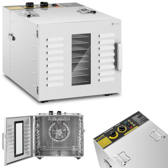 Suszarka posiada moc 1000 W, dzięki czemu szybko osiąga temperaturę roboczą 40-90deg;C. Regulacja mocy odbywa się za pomocą pokrętła. Timer pozwala na bezobsługową pracę do 15 godzin. Duża pojemność komory pozwana na jednoczesne suszenie dużej ilości produktów, które można rozmieścić na 10 ażurowych rusztach wykonanych ze stali nierdzewnej. Obudowa urządzenia także została wykonana ze stali nierdzewnej, która cechuje się dużą odpornością. 4 silikonowe maty odpowiadają za nieprzywieranie produktów do tacek, pozwalają wysuszyć wilgotne owoce typu banany, truskawki. Cechy produktu: