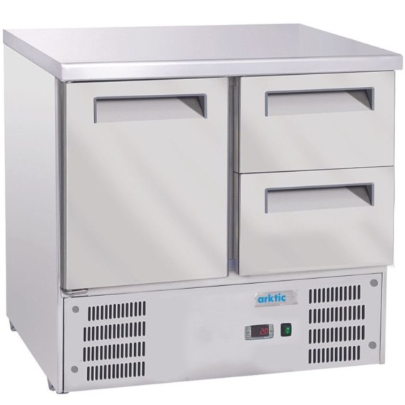 Kod produktu: 1030710 Stół chłodniczy Arktic z 1 drzwiami i 2 szufladami z panelem sterowania z cyfrowym termostatem, automatycznym cyklem rozmrażania i łatwym w demontażu filtrem kondensatora. Agregat umieszczony pod urządzeniem, z otworami wentylacyjnymi w obudowie zapewnia lepszą cyrkulację powietrza. Cechy produktu:
