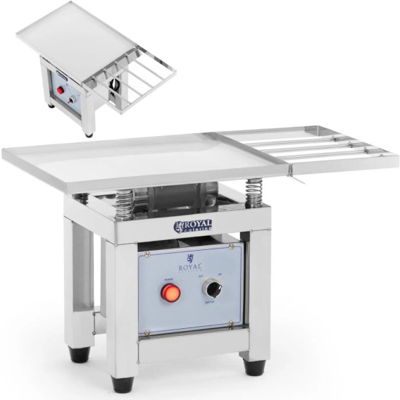 Kod producenta: 10012528 Stół wibracyjny marki Royal Catering pozwala przyrządzić idealną czekoladę w cukierni czy piekarni. Za jego pomocą można niezawodnie zagęszczać masę kakaową i unikać kieszeni powietrznych. Dzięki kompaktowej konstrukcji sprzęt można ustawić na dowolnym blacie. Dlatego nadaje się również dla małych producentów czekolady i cukierni. Dodatkowo konstrukcja jest bardzo prosta. Ciągła powierzchnia wytrząsająca pozwala szybko i łatwo wytrząsać bąbelki powietrza z masy czekoladowej. Na batonach natomiast usuwa nadmiar czekolady z foremek podczas robienia skorupek. Daje to czekoladzie pożądaną strukturę i stabilność. Stół wykonano z mocnej i higienicznej stali nierdzewnej, jest łatwy w czyszczeniu. Gumowane nóżki redukują wibracje na powierzchni roboczej i chronią blat przed zarysowaniami. Cechy produktu: