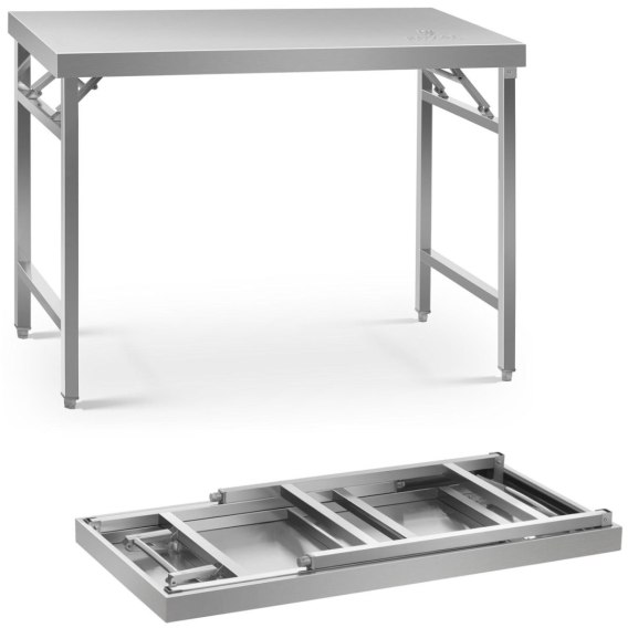 Stół posiada system składania sprężynowego - w szybki i łatwy sposób można go złożyć i transportować. Został wykonany ze stali nierdzewnej co jest gwarancją trwałości i stabilności w trakcie pracy. Jest odporny na korozję, uporczywe zabrudzenia i uszkodzenia mechaniczne. Nie wchodzi w reakcje z żywnością, jest bezpieczny dla zdrowia. Blat o wymiarach 120x70 cm zapewnia dużo miejsca a wysokość 85 cm daje komfort użytkowania. Dzięki regulowanym nóżkom wysokość stołu można zmienić w zakresie +/- 10mm. Udźwig stołu wynosi 215 kg. Cechy produktu: