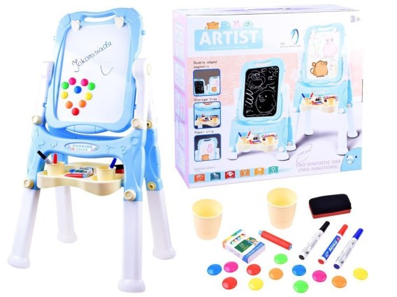 W skład zestawu chodzą: - tablica magnetyczna - magnesy - mazaki sucho ścieralne z gąbką - gąbka - kolorowa kreda - chwytak do kredy - kubki na pędzle, kredki ect - półka na przybory