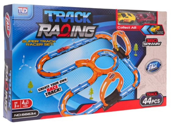 Tor wyścigowy z pętlami 360 stopni, dla dzieci od 3-go roku życia. Tor wykonano z najlepszej jakości plastiku w żywych kolorach. Na zestaw składa się 44 elementów do samodzielnego montażu. Tor posiada odcinki proste do rozpędzenia pojazdu, dwie pętlę 360 stopni i dwa pojazdy. Pojazdy napędzane są napędem pull back. Wystarczy delikatnie nacisnąć pojazd do tyłu, by przejechał tor z pełną mocą.