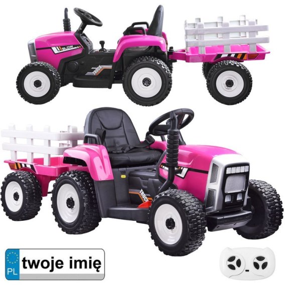 Fantastyczny traktor z przyczepą dla każdego małego kierowcy zapewni mnóstwo wesołej zabawy.  Traktor z efektami dźwiękowymi i świetlnymi, panelem muzycznym będzie pasował do każdego gospodarstwa. Traktor posiada komfortowy fotel obszyty ekoskórą, lewarek do zmiany biegów, oraz kierunku jazdy, włącznik do świateł. Wolny start w pojeździe zapewni komfortowe ruszanie maszyną. Dwa mocne silniki i akumulatory zapewnią dotarcie w każde miejsce.