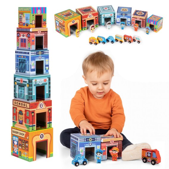 Kreatywna konstrukcja - to prawdziwa gratka dla małych budowniczych! Kolorowe, sześcienne pudełka można układać w wysoką wieżę lub zestawiać jako rozbudowane miasteczko. W trakcie zabawy dziecko naturalnie rozwija koordynację, orientację przestrzenną oraz umiejętność dopasowywania kształtów. Każda kostka jest ponumerowana (od 1 do 6) i opatrzona angielską nazwą budynku, co wprowadza cenny element edukacyjny.