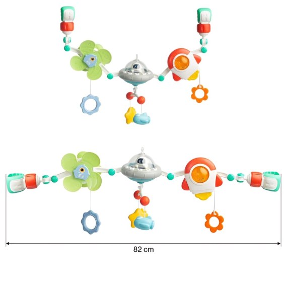 Pałąk Łuk z Zabawkami od marki WOOPIE z serii WOOPIE BABY to uniwersalna zabawka, która doda uroku i rozrywki każdemu wózkowi, fotelikowi czy łóżeczku. Jest niezwykle elastyczny, dzięki czemu bez problemu można go zamocować praktycznie wszędzie. Na pałąku znajdują się różne zabawki. Zabawka przykuwa uwagę i utrzymuje aktywność oraz ciekawość dziecka podczas przebywania w wózku czy foteliku. Interaktywny pałąk gra przepiękne kołysanki oraz świeci zmieniającymi się kolorowymi światełkami. Zaprojektowana by rozwijać ruchy całego ciała i oddziaływać na zmysły.