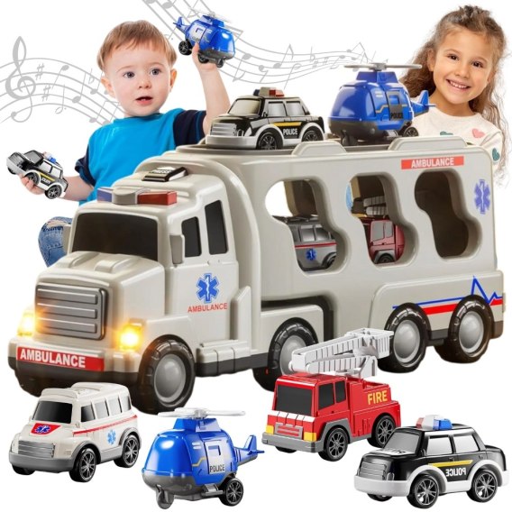 Duży Zestaw Ratunkowy Ciężarówka+4 Auta od Marki Woopie Zaprojektowana z myślą o małych pasjonatach straży pożarnej, policji,pogotowia ta zabawka 5 w 1 to idealny zestaw dla każdego małego ratownika! Naciśnij przycisk na górze kabiny ciężarówki, aby zobaczyć jasne migające światła i usłyszeć realistyczne syreny, bardzo atrakcyjne dla dzieci. Zestaw zawiera dużą ciężarówkę transportową oraz cztery pojazdy ratunkowe: samochód strażacki, radiowóz, helikopter policyjny, karete. Każdy z pojazdów ma ruchome elementy, które pozwolą Twojemu dziecku poczuć się jak prawdziwy bohater podczas akcji ratunkowych! Zestaw jest świetnym pomysłem na prezent urodzinowy, świąteczny czy na inne okazje.