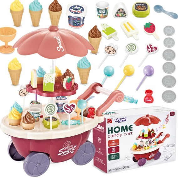 Wózek z Lodami marki Woopie będzie idealna zabawką dla Twojego maluszka i jego przyjaciół -nie tylko w upalne dni! Zabawka zapewnia kreatywną zabawę, odgrywanie ról, rozwija wyobraźnie i inne zdolności do prawidłowego rozwojudziecka. Zabawa w "sprzedawcę" i "kupującego" pomoże rozwinąć świadomość i zdolności społeczne. Posiada wiele akcesoriów z najwyższej jakości dodatkami/naklejkami do zabawy/"sprzedaży" ze szczegółowymi modelami rożków do lodów, patyczków do lodów, lizaków lodowych, słodkich lizaków z rysunkowymi twarzami oraz innymi elementami, jak kanapki, pudełka na słodycze i przekąski, pucharki na lody, pudełko popcornów i butelka na sok. Dodatkowo niezbędnymi elementami zestawu są monety, które zachęcądzieci do nauki podstawowych umiejętnościmatematycznych i finansowych podczas dokonywania zakupów. Oprócz bogatych dodatków posiada liczne specjalne funkcje: dźwiękowe (melodie włączane za pomocą guzika na blacie wózka), świetlne (kolorowy świecący trzon parasolki), w pełni obracająca się o 360 stopni parasolkę z półką, a samo stoisko po złożeniu parasolki i akcesoriów może przechowywać elementy wewnątrz wózka.