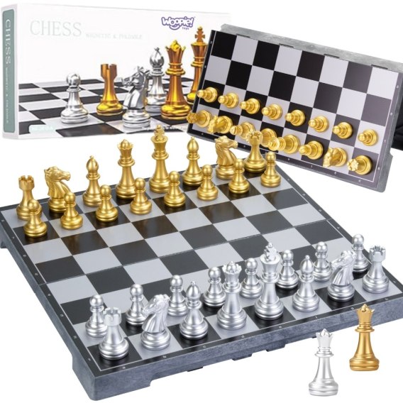 Składany magnetyczny zestaw do gry w szachy od marki Woopie to elegancka i praktyczna propozycja dla miłośników klasycznych gier strategicznych, którzy cenią mobilność i estetykę. Wyposażony w elementy w kolorze złotym i srebrnym, z magnetyczną planszą, zapewnia stabilność figur nawet podczas przenoszenia gry. Dzięki składanej konstrukcji oraz kompaktowym wymiarom idealnie sprawdzi się zarówno w domu, jak i w podróży — w pociągu, na wakacjach czy podczas wizyty u znajomych. Figury wykonane są z lekkiego, trwałego materiału, z metalicznym wykończeniem — złotym i srebrnym — co dodaje elegancji i prestiżu kompletowi. Mechanizm składania umożliwia zmniejszenie całej planszy do kompaktowych wymiarów, co ułatwia przechowywanie i transport zestawu bez ryzyka rozsypania figur.