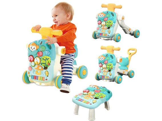 • Zabawkę z możliwością przekształcenia w chodzik - pchacz, jeździk, jeździk z dodatkową asekuracją oraz stolik edukacyjny,