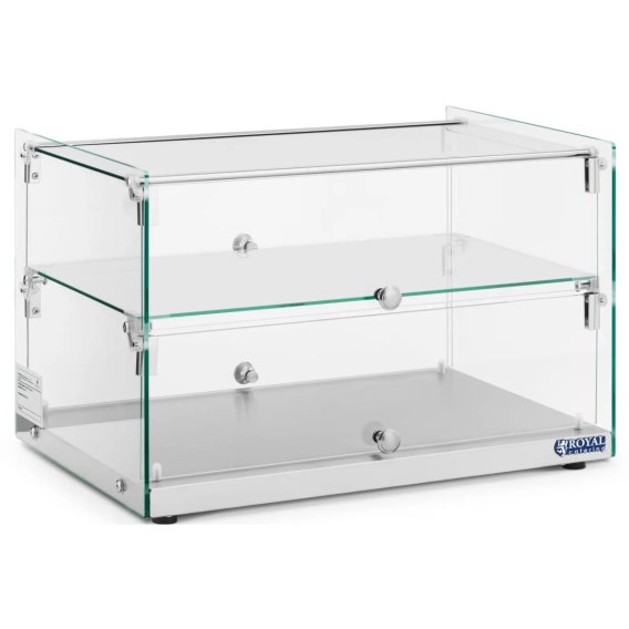 Kod producenta: 10012871 Witryna marki Royal Catering pozwala prezentować ciasta, tarty, bajgle, desery i inne przysmaki w kuszący sposób. Elegancka witryna neutralna sprawdzi się na ladach w piekarniach, cukierniach, bistro, kawiarniach i wszędzie tam, gdzie świeżo przygotowane specjały mają być atrakcyjnie prezentowane i jednocześnie utrzymane w świeżości. Pojemność 50 l oraz 2 poziomy o wymiarach 54 x 29,5 cm oferują dużo miejsca. Na każdej półce można umieścić do 10 kg ciast, pieczywa i innych przysmaków. Duże drzwi z przodu gabloty panoramicznej umożliwiają łatwe napełnianie i wyjmowanie produktów. Witryna została wykonana ze szkła hartowanego i stali nierdzewnej, wygląda wyjątkowo elegancko, ale również imponuje długą żywotnością. Jest też bardzo łatwa w czyszczeniu. Antypoślizgowe nóżki zapewniają pewne oparcie i niezawodnie chronią powierzchnię blatu przed zarysowaniami czy uszkodzeniami. Cechy produktu: