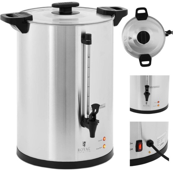 Kod producenta: 10012902 Zaparzacz do kawy marki Royal Catering idealnie nadaje się do produkcji dużych ilości kawy, ale także do parzenia i utrzymywania ciepła herbat lub innych naparów ziołowych. Ekspres o pojemności 20 l i mocy 1650 W szybko podgrzewa gorące napoje i utrzymuje je w odpowiedniej temperaturze. Obudowa zaparzacza została wykonana ze stali nierdzewnej, a nienagrzewające się uchwyty pozwalają na bezpieczne przenoszenie urządzenia nawet po zaparzeniu napoju. Pokrywa ze stali posiada mechanizm blokujący, który zapobiega rozlaniu napoju i zapobiega przed jego zanieczyszczeniem. Zintegrowany wskaźnik poziomu wskazuje liczbę filiżanek i ułatwia porcjowanie kawy. Ekspres pozwoli na napełnienie około 125 filiżanek za pomocą kranu dozującego, który gwarantuje czystość bez kapania. Taca ociekowa przymocowana do podstawy zaparzacza zapewnia wysoki poziom higieny i łatwe czyszczenie. Cechy produktu: