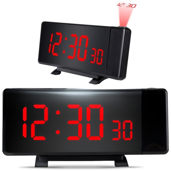 Kod produktu: 1030093 Budzik z projektorem LED to praktyczne i eleganckie urządzenie do sypialni. Umożliwia wyświetlanie godziny zarówno na czytelnym wyświetlaczu LED, jak i na suficie dzięki projektorowi z regulacją kąta. Wyposażony w 10-stopniową regulację głośności oraz czujnik światła automatycznie dopasowujący jasność ekranu. Dzięki kompaktowym wymiarom i nowoczesnemu designowi dopasuje się do każdego wnętrza. Cechy produktu: