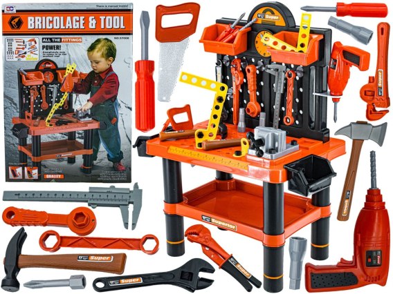 Zabawka posiada solidny stolik z dodatkową podstawką i pojemniczkami na drobiazgi oraz wygodną tablicę narzędziową z dziurkami i uchwytami, które pozwalają zachować porządek wśród dużej liczby przeróżnych narzędzi.