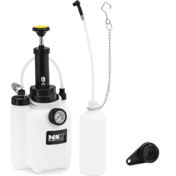 Kod producenta: 10062088 Odpowietrznik hamulców marki MSW to wszechstronna ręczna pompa próżniowa. Dzięki bogatej gamie akcesoriów, oprócz odpowietrzania i wymiany płynu hamulcowego, można sprawdzić ustawienia i funkcje układów pneumatycznych czy hydraulicznych. Dzięki gwintowi 45 mm narzędzie motoryzacyjne nadaje się do prawie wszystkich europejskich typów pojazdów i nie powinno go zabraknąć w żadnym warsztacie samochodowym lub samochodowym. Urządzenie pozwala szybko i łatwo sprawdzić przewody, a w razie potrzeby bezpośrednio uzupełnić lub wymienić płyn hamulcowy. Następnie możliwe jest również odpowietrzenie hamulców. Można go użyć także do testowania systemów ciśnieniowych i próżniowych, co ułatwia rozwiązywanie różnorodnych problemów. Oprócz licznych opcji połączeń sprzęt dysponuje dużym i czytelnym manometrem z podwójną skalą. Zapewnia on wszechstronne oraz łatwe użytkowanie. Tester ciśnienia pracuje z dużą dokładnością w zakresie pomiarowym od -2,07 do 2,76 bar. Do odpowietrzania nie potrzeba żadnych narzędzi pomocniczych ani zewnętrznego źródła zasilania: po prostu należy napełnić i pompować. Zestaw został zaprojektowany tak, aby jedna osoba mogła sprawdzić i odpowietrzyć hamulce. Odpowietrznik jest wykonany z wyjątkowo stabilnego i odpornego na korozję tworzywa sztucznego. Dzięki wytrzymałemu materiałowi urządzenie do odpowietrzania jest bardzo trwałe oraz łatwe w czyszczeniu. Cechy produktu: