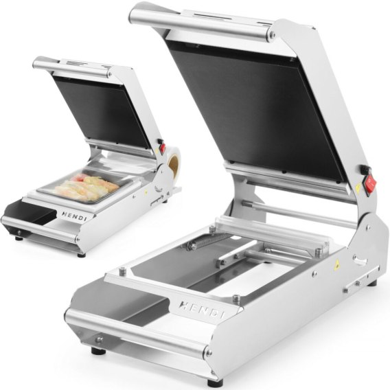 Zgrzewarka do tacek firmy Hendi służący do szczelnego pakowania świeżych produktów spożywczych. Przeznaczona jest do użytku dla firm cateringowych, restauracji i supermarketów. Solidna i stabilna konstrukcja ze stali nierdzewnej. Pokrywa z mechanizmem sprężynowym dla łatwego i bezpiecznego otwierania. Proces zgrzewania ułatwia zastosowanie łożysk i specjalnego tworzywa ślizgowego. Amortyzator docisku zapewnia szczelność pakowania i zapobiega zgniataniu opakowań. Rączka wykonana została z odpornego na uszkodzenia tworzywa. Automatycznie wysuwana gilotyna umieszczona w specjalnej listwie tnie folię tuż za zgrzewanym pojemnikiem (technologia air-cut). Powierzchnia zgrzewająca pokryta powłoką titanium, która zapobiega przywieraniu folii oraz umożliwia szybki zgrzew w 1-3 sekundy. Czas nagrzewania po uruchomieniu do pełnej gotowości to około 8-10 minut. Regulacja temperatury w zakresie 50-210deg;C. Kolorowe diody do monitorowania pracy urządzenia. Zgrzewarka posiada zabezpieczenie przed przegrzaniem oraz podświetlany wyłącznik bezpieczeństwa. Antypoślizgowe nóżki stabilizują pakowarkę podczas pracy. W zestawie matryca na tackę bez podziału 227x178 mm.