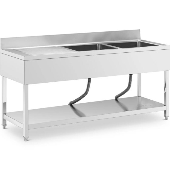 Kod producenta: 10013160 Zlew marki Royal Catering to idealne rozwiązanie do kuchni komercyjnych, restauracji i podobnych obiektów, a także laboratoriów. Kompaktowy stół ma dwa wyjątkowo pojemne zlewy, do pomieszczenia dużych i nieporęcznych garnków, patelni lub rusztów grillowych. Obok umywalek o wymiarach 500 x 400 x 250 mm każda znajduje się ociekacz do suszenia umytych naczynia. Ponadto praktyczny rant o wysokości 120 mm ochroni ścianę przed zachlapaniem. Zlew wykonany został w całości z wytrzymałej stali nierdzewnej. Jest trwały, odporny na korozję i zachowuje połysk przez długi czas. Dzięki ponadczasowemu wzornictwu pasuje do każdej kuchni. Sprzęty ze stali nierdzewnej są również szybkie i łatwe w czyszczeniu. Nóżki są regulowane w zakresie 50 mm aby zachować stabilność nawet na nierównej podłodze. Cechy produktu: